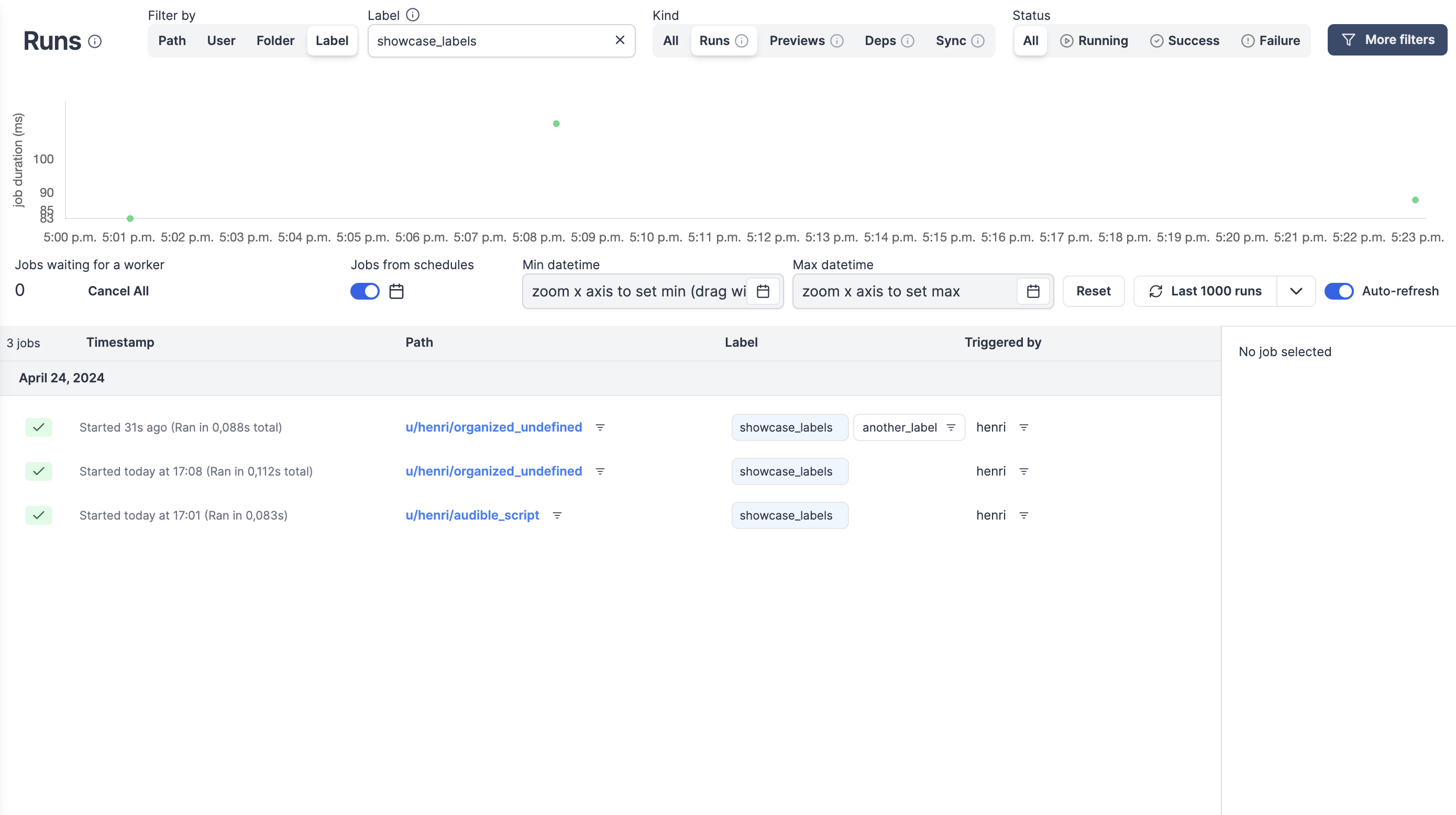 • Job retention health: compares oldest completed job age to retention_period_secs with green/yellow/red status.